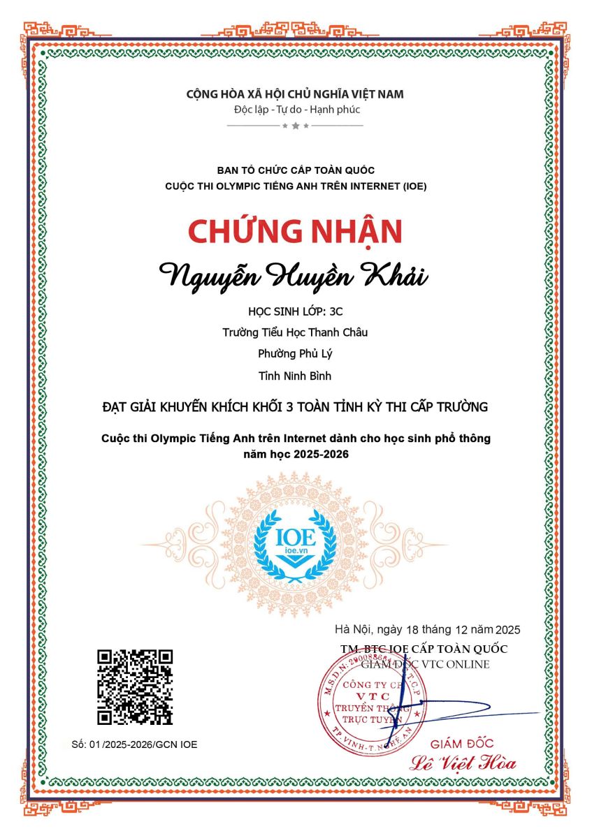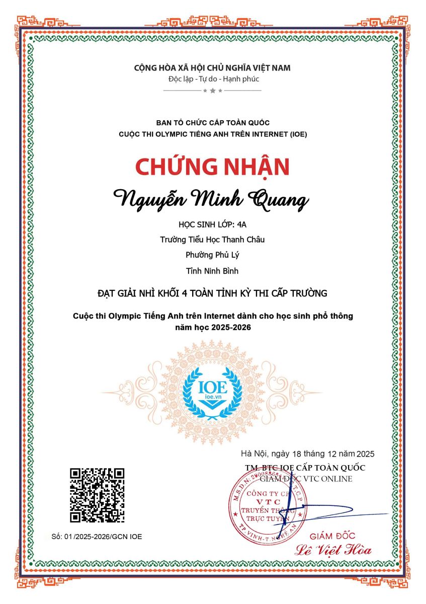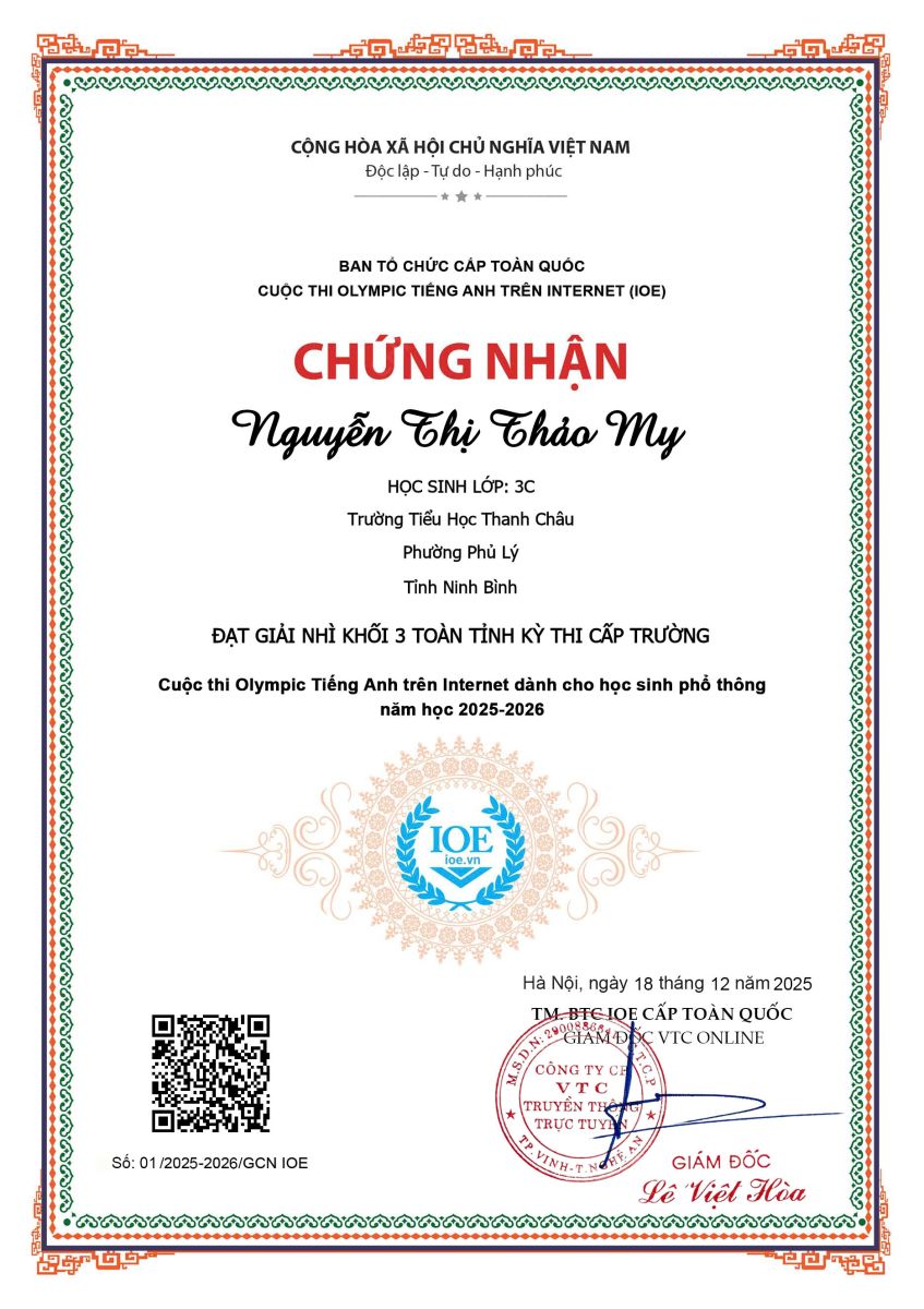 Trường Tiểu học Thanh Châu nhiệt liệt biểu dương và chúc mừng các em học sinh đã hoàn thành xuất sắc Cuộc thi Olympic Tiếng Anh trên Internet (IOE) cấp Trường năm học 2025 – 2026.