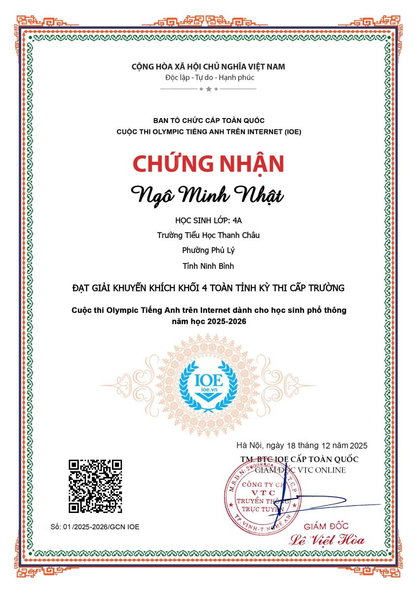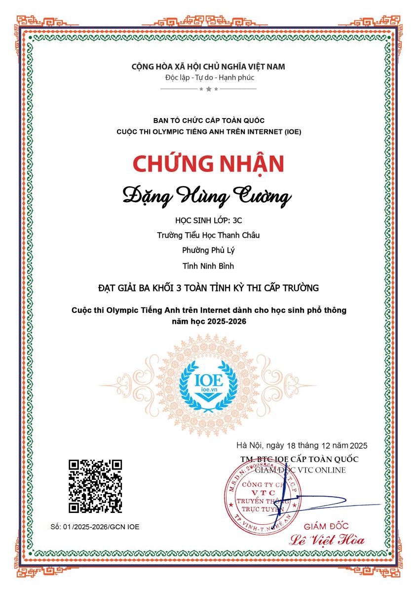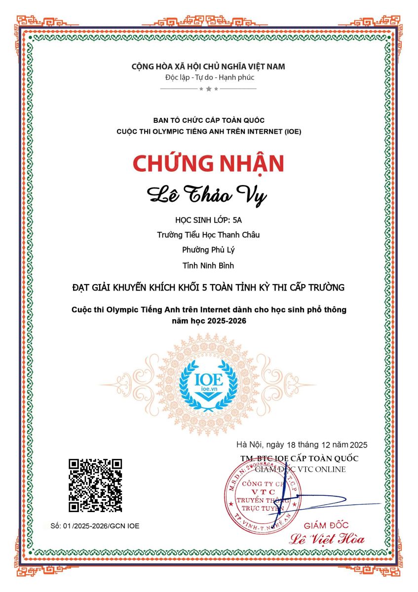 Trường Tiểu học Thanh Châu nhiệt liệt biểu dương và chúc mừng các em học sinh đã hoàn thành xuất sắc Cuộc thi Olympic Tiếng Anh trên Internet (IOE) cấp Trường năm học 2025 – 2026.