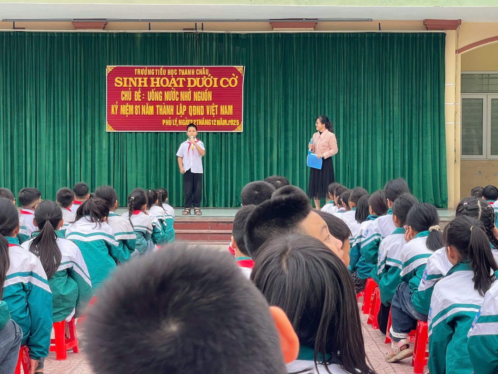 Hướng tới kỷ niệm 81 năm ngày thành lập Quân đội Nhân dân Việt Nam (22/12/1944 – 22/12/2025), sáng nay, ngày 22-12 trường Tiểu học Thanh Châu đã tổ chức thành công tiết sinh hoạt dưới cờ với chủ điểm “Uống nước nhớ nguồn” Hoạt động nhằm giáo dục truyền thống cách mạng và lòng tự hào dân tộc cho thế hệ măng non.